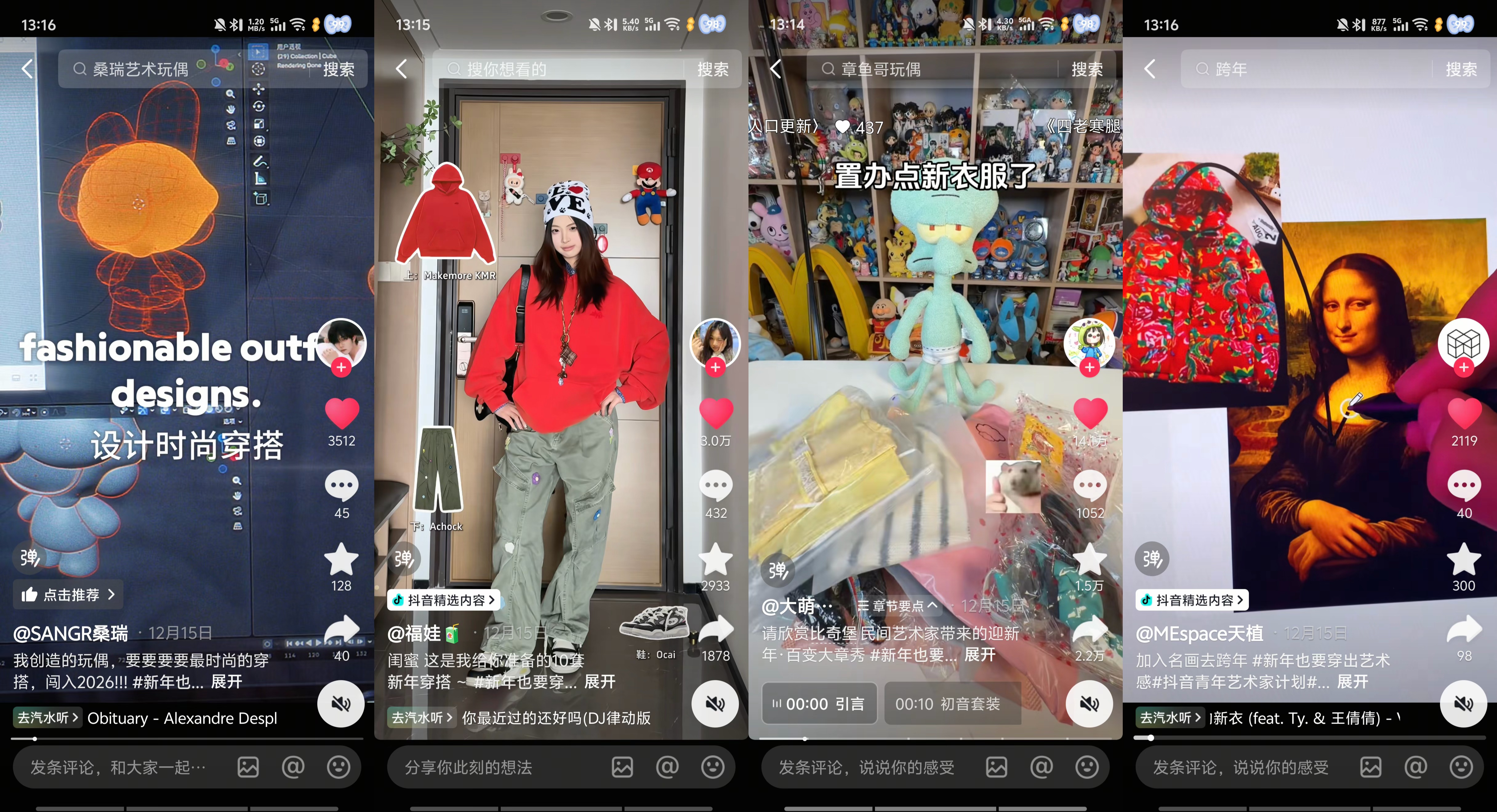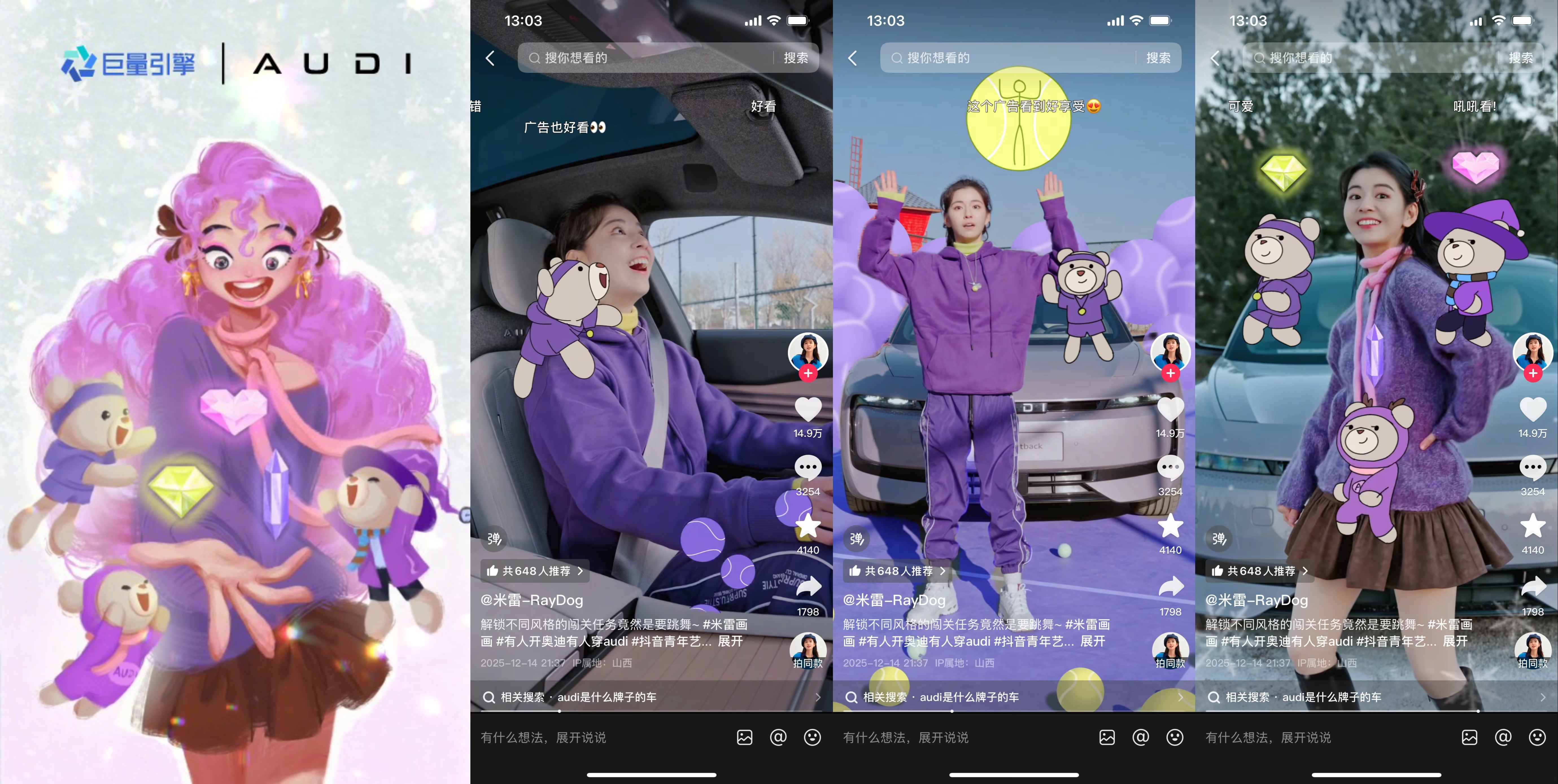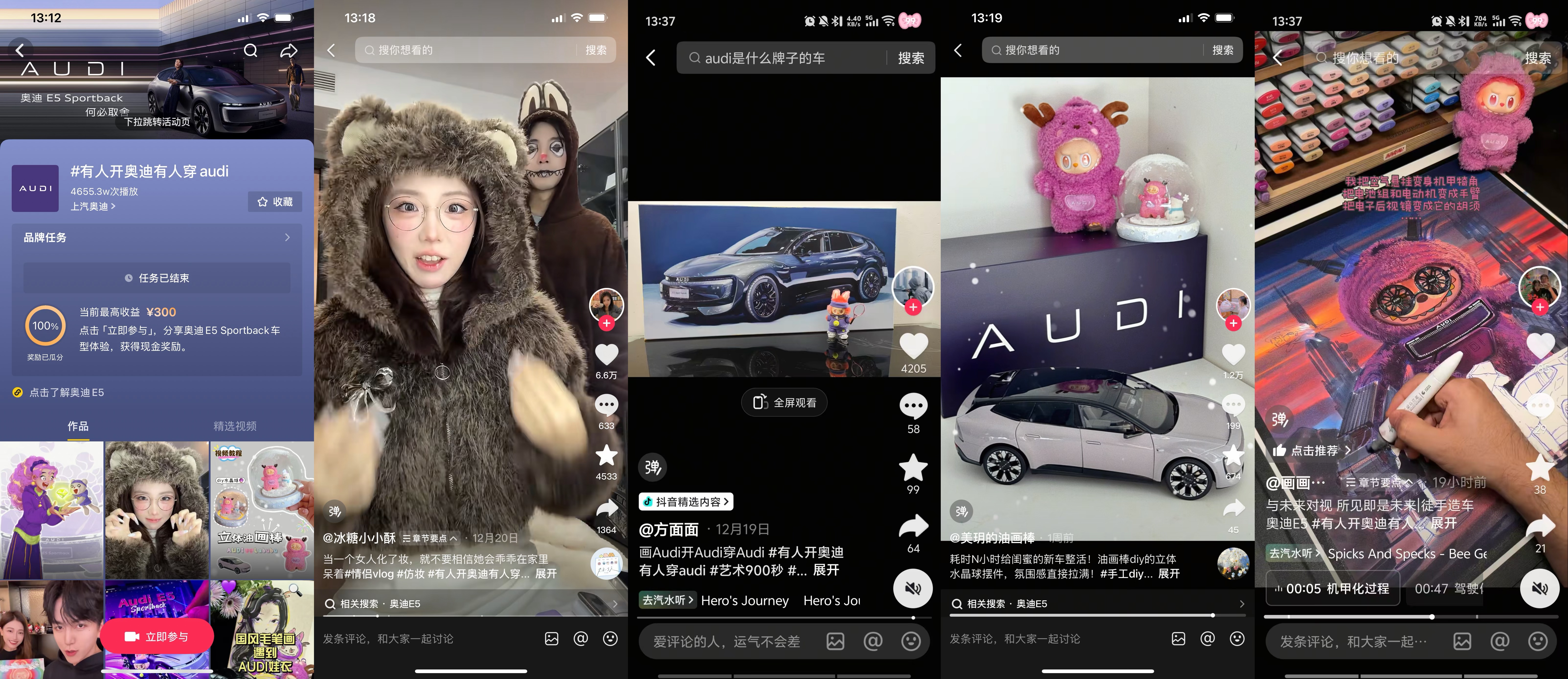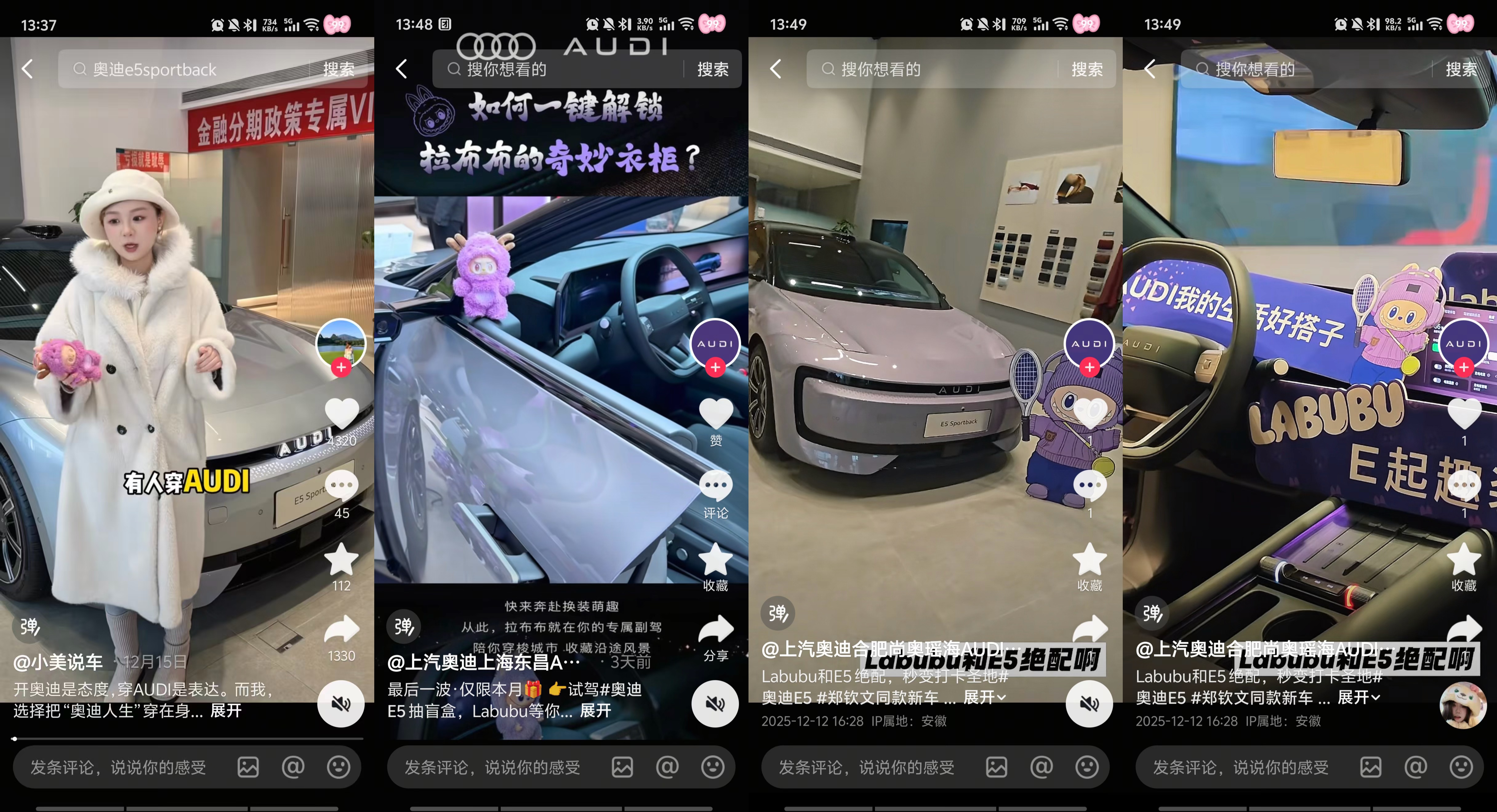 AUDI 与「艺术900秒」以米雷的优质视频为核心抓手,在抖音平台迅速搭建起多层次艺术内容传播矩阵,重磅推出#有人开奥迪有人穿AUDI 传播话题,通过星选创作任务与「抖音青年艺术家计划」招募艺术、时尚、旅行等领域跨界KOL,鼓励创作者围绕 AUDI 娃衣核心元素融入个人风格,对娃衣设计与车型亮点展开创意二创,KOL们纷纷脑洞大开:时尚博主夫妇围绕奥迪 E5娃衣进行仿妆PK,艺术博主为闺蜜的奥迪 E5新车巧手打造娃衣手工摆件,旅行博主带着身穿奥迪 E5娃衣的Labubu去打卡旅途,艺术感与趣味感兼具的PUGC内容持续放大跨界声量,进一步拓宽了 AUDI 品牌的圈层触达边界。