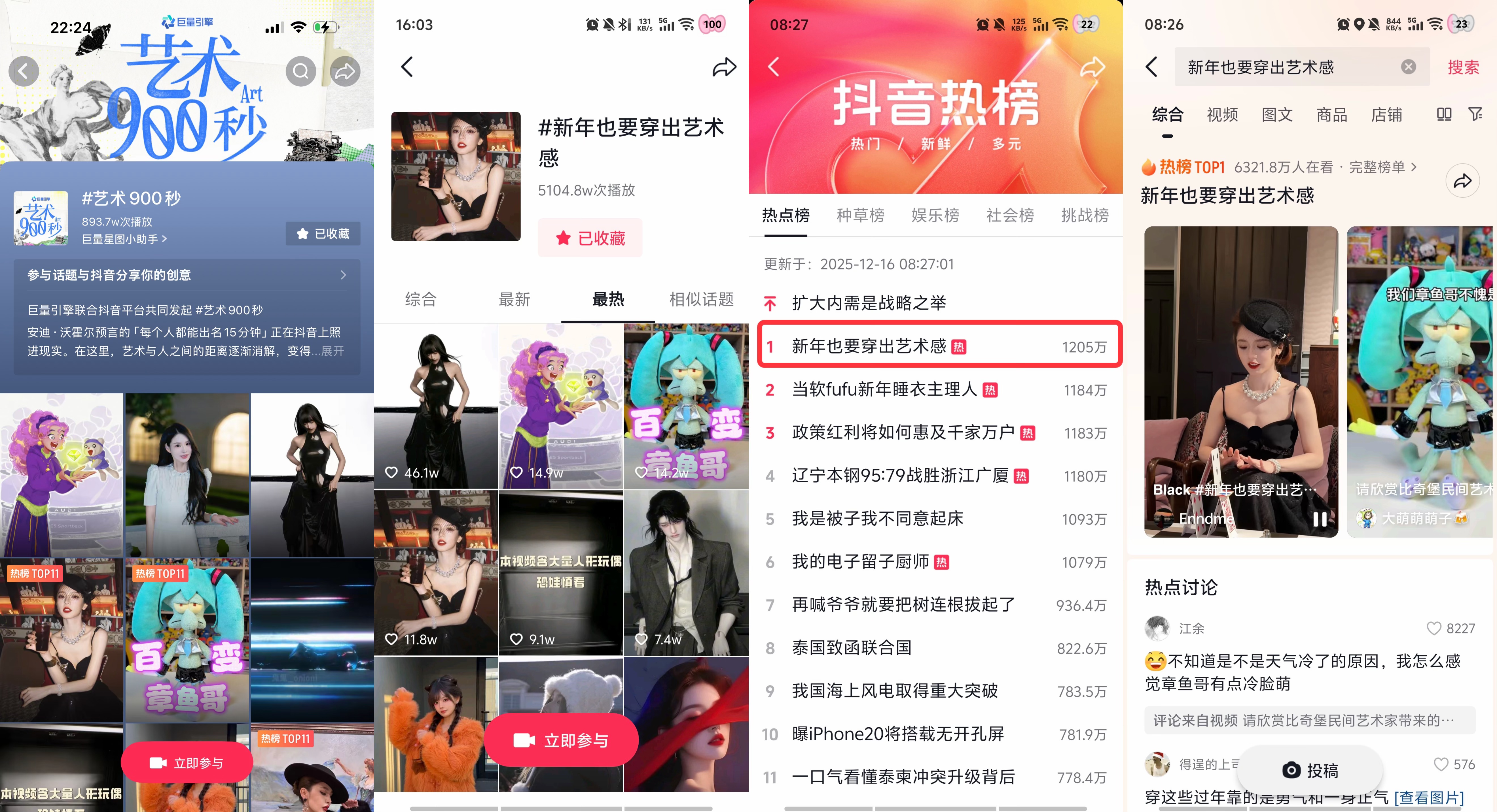 圈层热度的持续发酵,为传播进一步破圈奠定了坚实基础。借助新年节点热点契机与圈层积攒的传播势能,「艺术900秒」发起 #新年也要穿出艺术感 话题,邀请用户用创意巧思诠释新年穿搭艺术,话题一经上线便激发 大众的参与热情,众多优质KOC与普通用户受到AUDI换装创意的启发,结合生活、出行、试驾等多元场景,晒出自己的新年换装秀,全民共创催生的海量 UGC 内容,推动话题火速跻身抖音热榜 TOP1,曝光量累计突破5100W。品牌不仅实现了传播声量的全面破圈,更成就了抖音平台上又一场优质内容的现象级爆发。